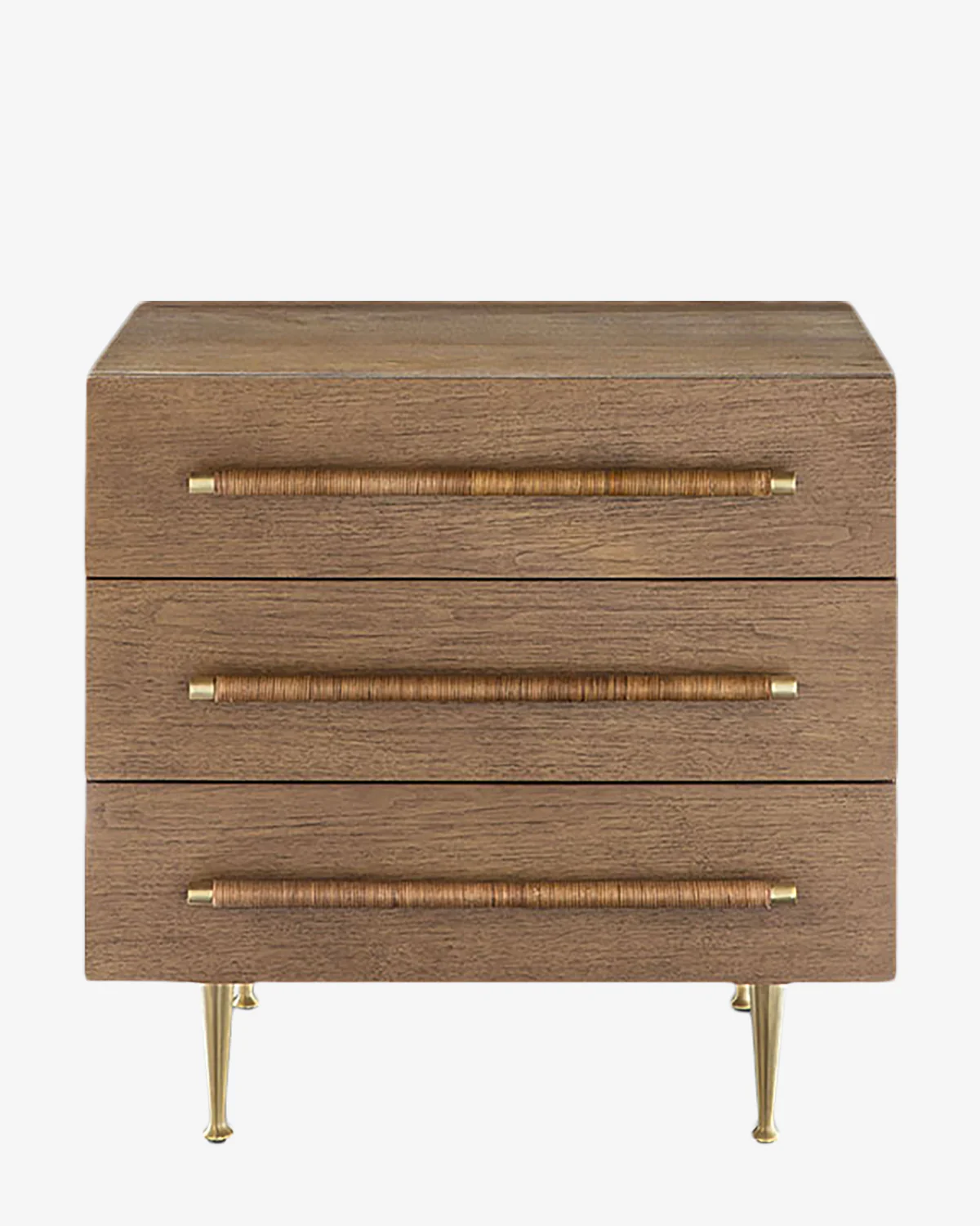 The Westlyn Nightstand is modern but classic. Brass accents and hand-wrapped drawer pulls, show great attention to detail while making a distinctive statement to your bedside.